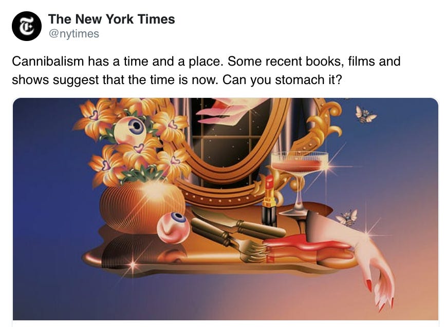 "Kannibalismus hat eine passende Zeit und einen passenden Ort. Einige neuere Bücher, Filme und Serien legen nahe, dass diese Zeit jetzt gekommen ist. Verkraften Sie das?"